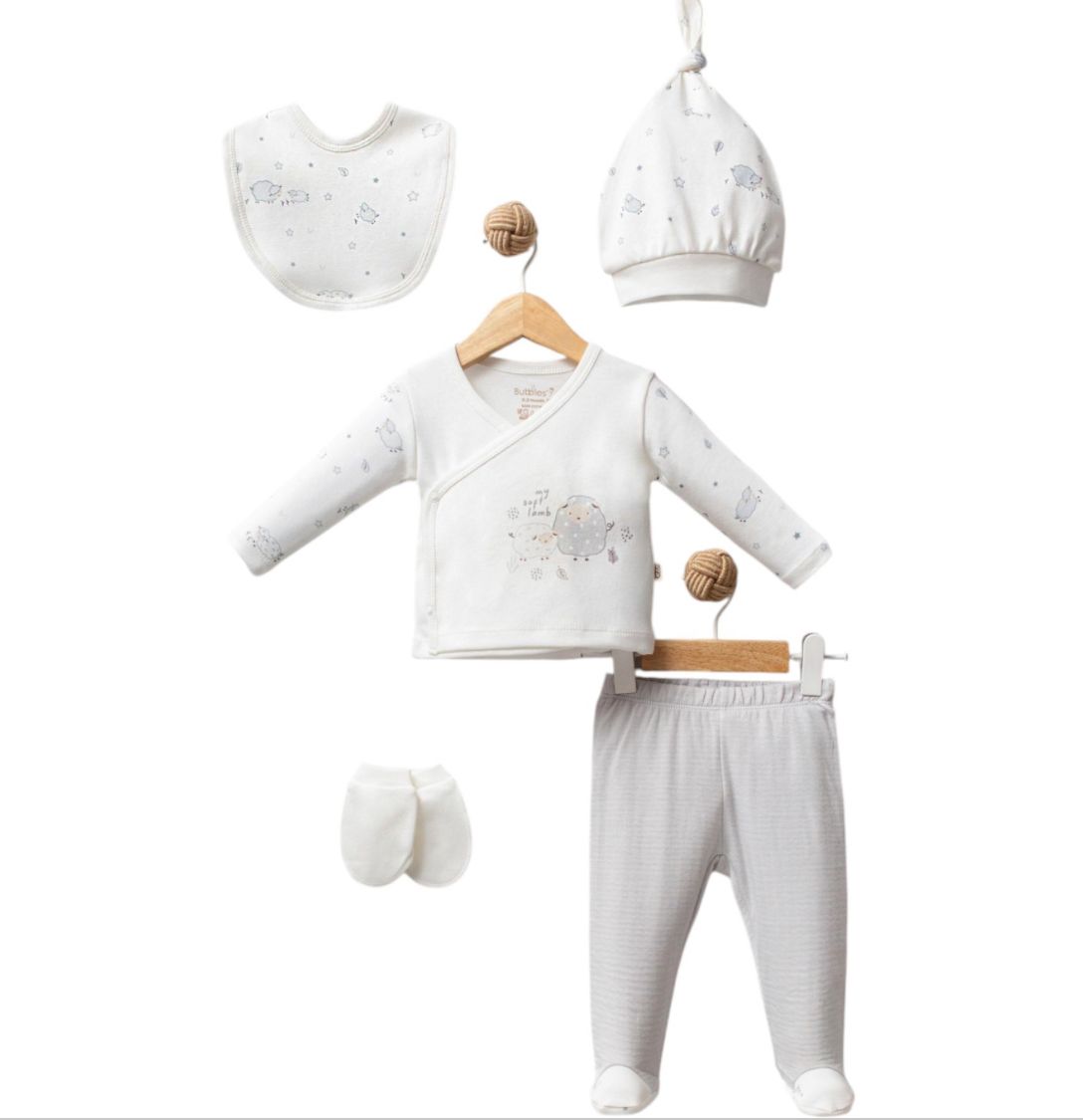 Kuzu Desenli Organik Kumaş Erkek Bebek 5'li Hastane Çıkış Takımı