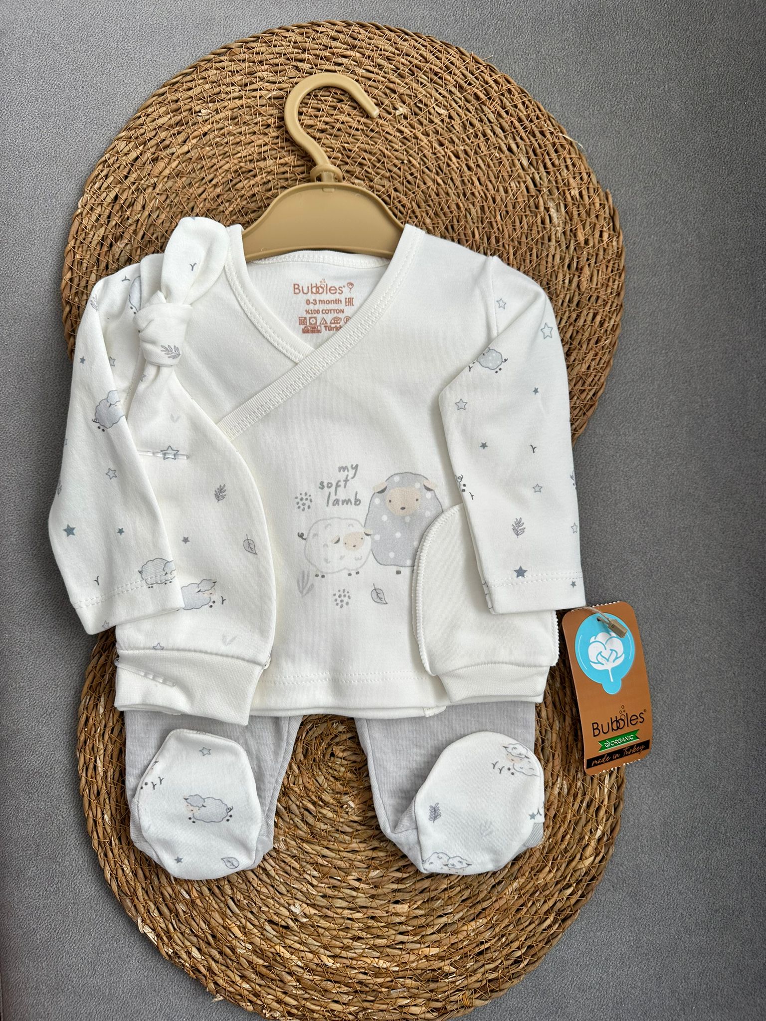 Kuzu Desenli Organik Kumaş Unisex 5'li Hastane Çıkış Takımı 1 adet kruvaze üst, 1 adet patikli müslin pantolon, 1 adet şapka, 1 adet önlük ve 1 çift eldivenden oluşmaktadır. %100 pamuk organik kumaştan üretilmiştir.