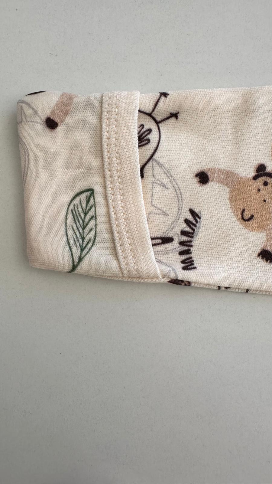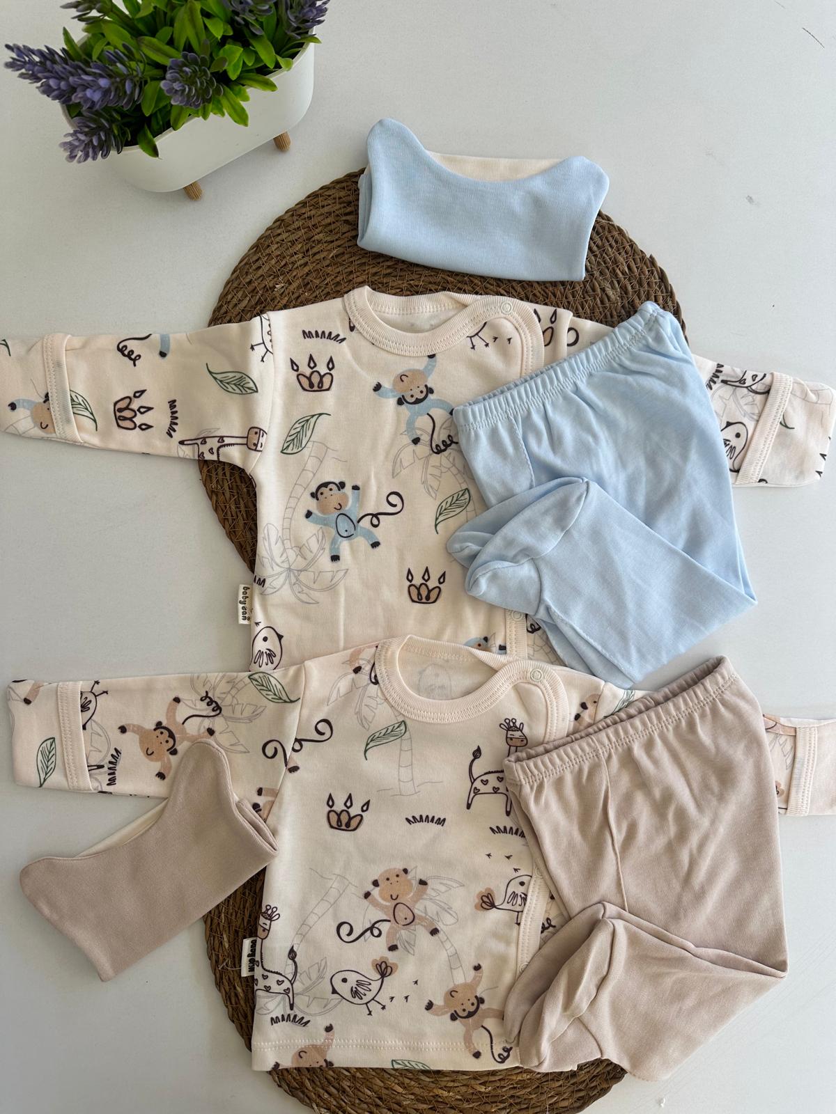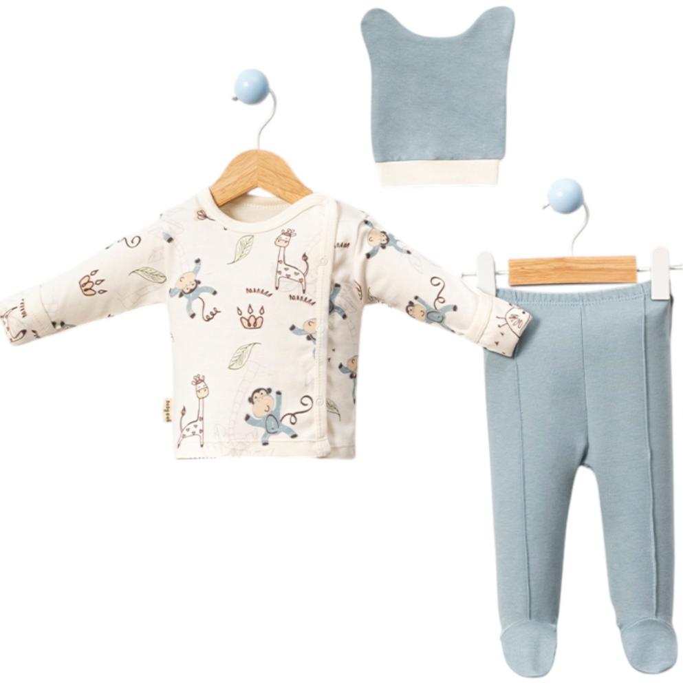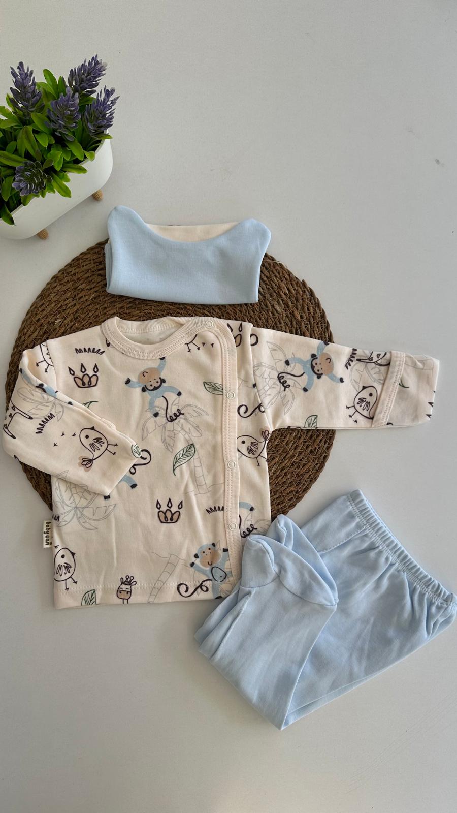 Maymun Baskılı Mavi 3'lü Erkek Bebek Takım %100 pamuk, 1 adet üst, 1 adet patikli pantolon ve 1 adet şapkadan oluşmaktadır.Kendinden eldivenlidir.