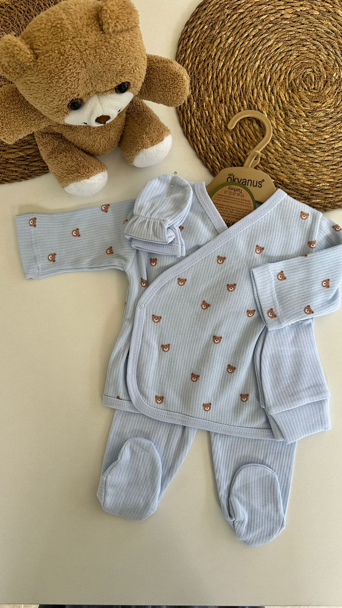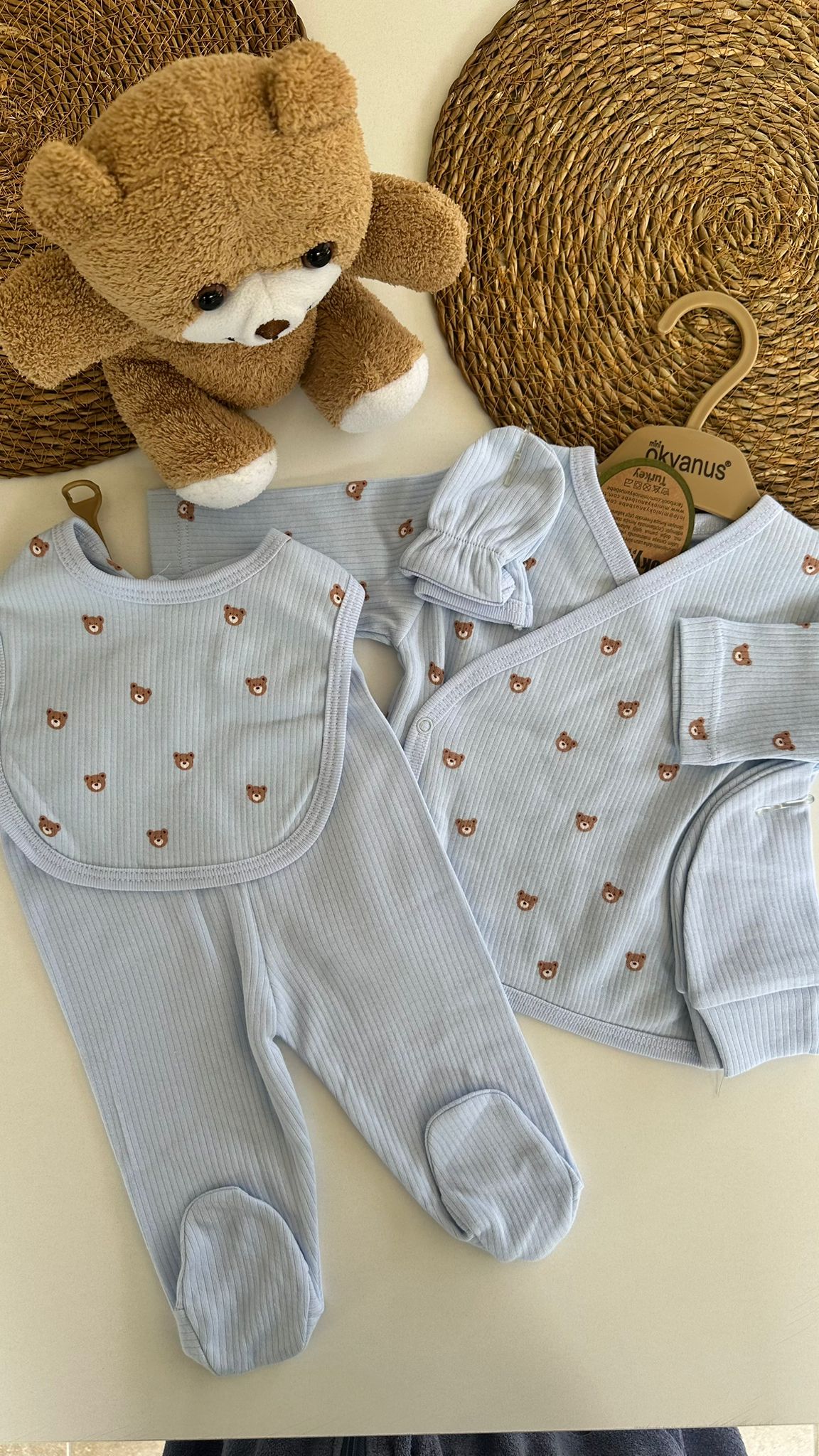 Sevimli Ayıcık Desenli Erkek Bebek Mavi 5'li Zıbın Takımı %100 pamuk nefes alan kumaştan üretilmiştir. Yenidoğan bebeğinizin cildine dost kumaşıyla üst düzey konfor sağlar. Takım 1 adet Kruvaze Üst Zıbın, 1 adet patikli pantolon, 1 çift eldiven, 1 adet şapka ve 1adet önlükten oluşmaktadır.
