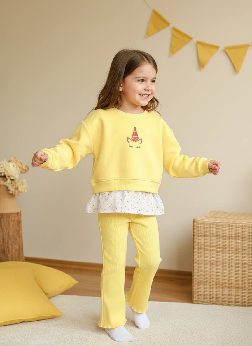 Unicorn Baskılı Sarı Gömlek Detay Ribana Taytlı Kız Çocuk Takım %100 pamuk 3 iplik fırçalı kumaştan üretilmiştir. Alt ribana tayt. üst gömlek detaylıdır.
