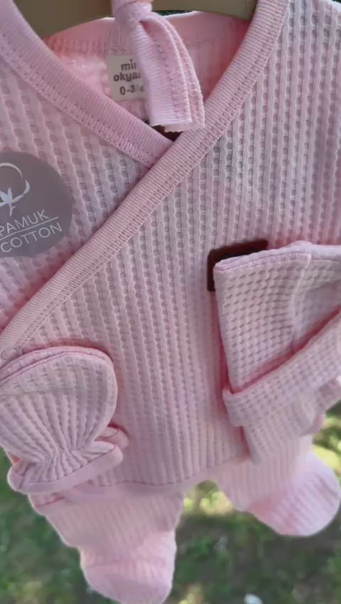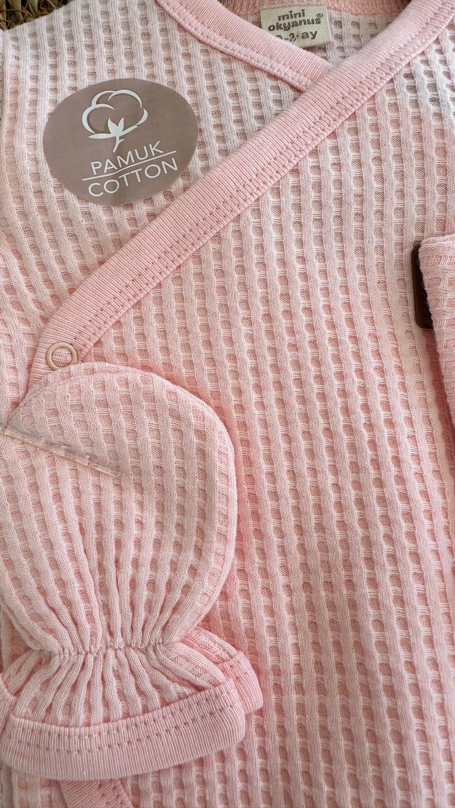Waffle Kumaş Pembe Kız Bebek 5'li Hastane Çıkış Zıbın Takımı