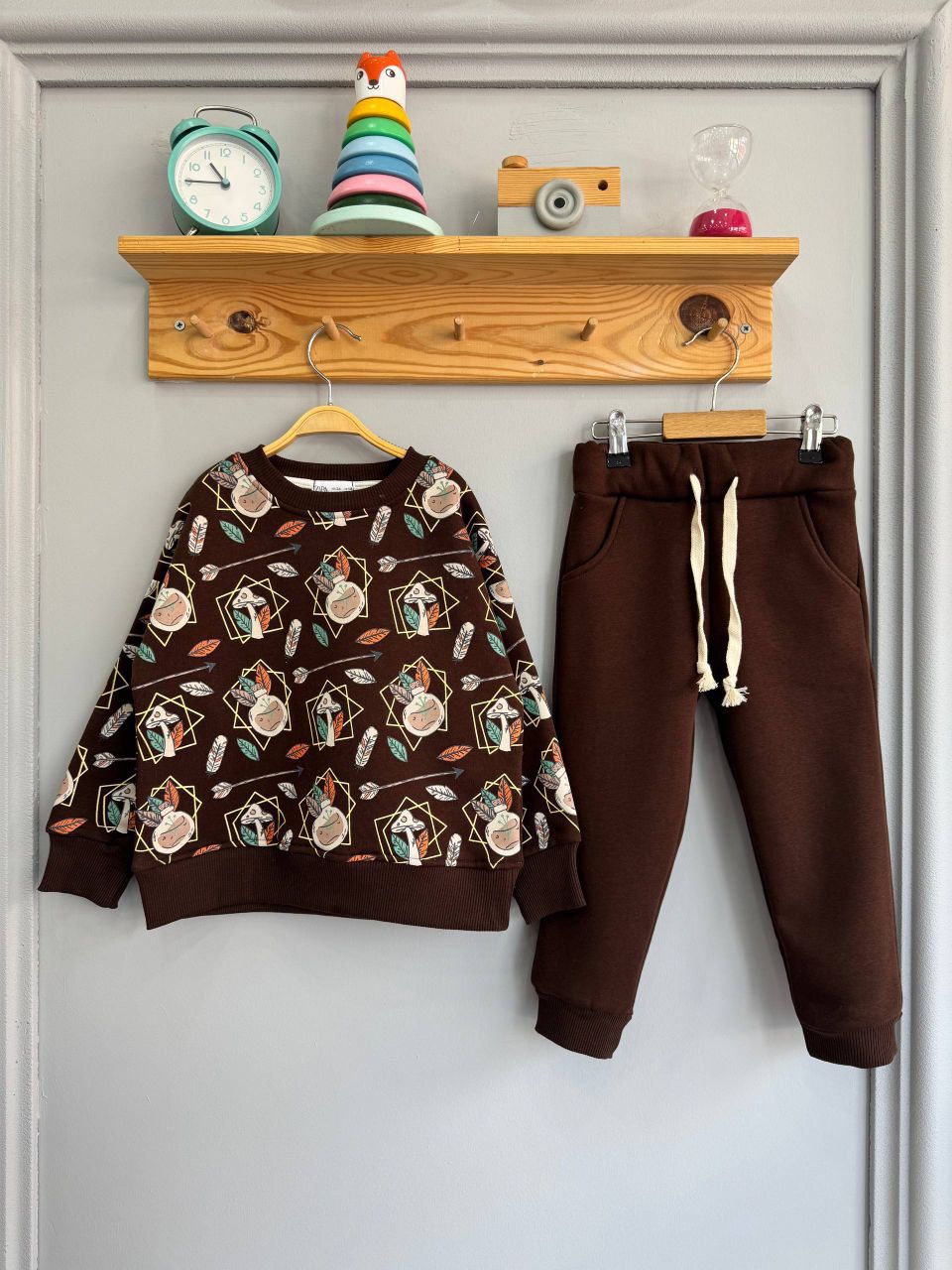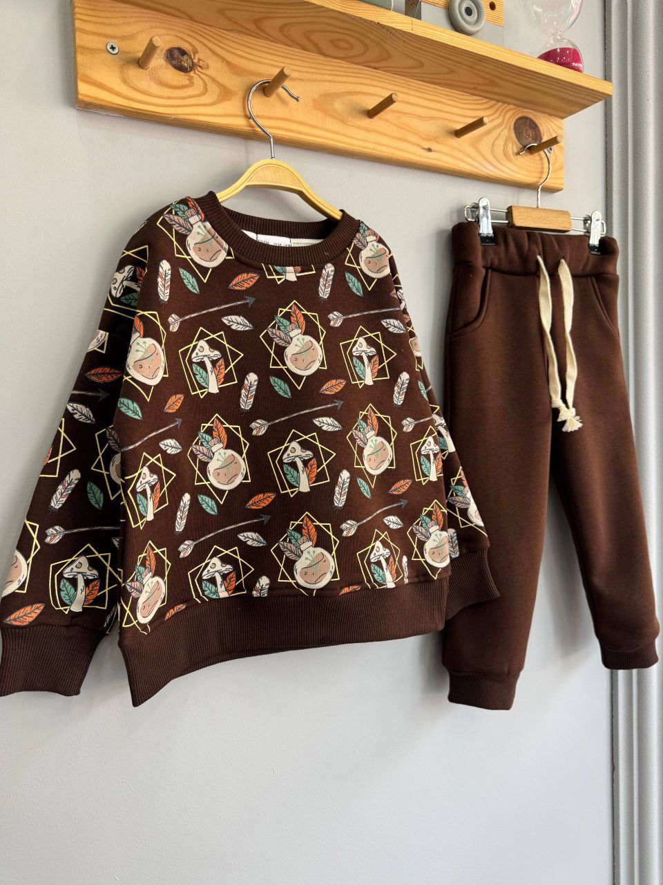 Yaprak Desenli Kahve Erkek Çocuk Takım %100 pamuk 3 iplik fırçalı kumaştan üretilmiştir.